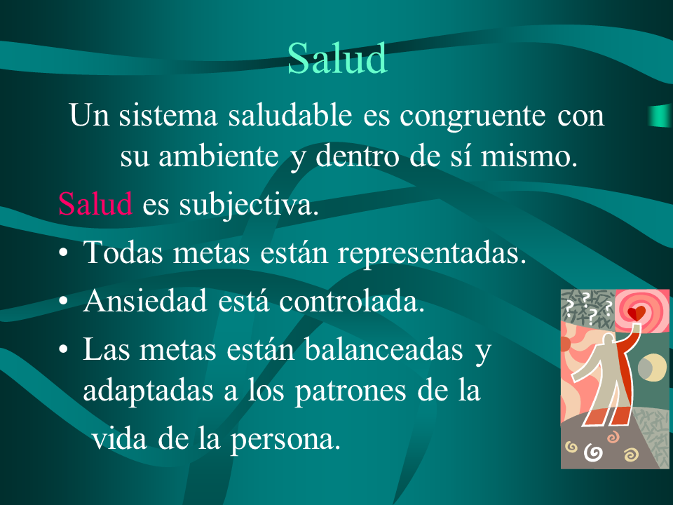 Salud es la congruencia sentida dentro del sistema y entre el sistema y su ambiente. Así, nunca está completamente llevada a cabo. Salud optimal es el producto de un proceso sistémico de vida balanceada y es una experiencia subjuntiva muy personal.