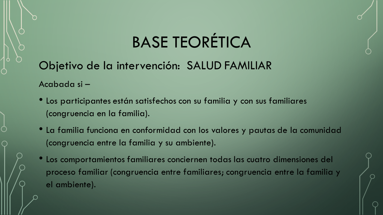El modelo de intervención "Congruencia" significa una manera de usar el Marco Teórico de Organización Sistémica en la práctica de la enfermería. El modelo fue evaluado sistemáticamente y usado con familias las que tenían miembros en tratamiento del abuso de drogas [Véase Friedemann, M. L. (1994). Evaluation of the Congruence Model with rehabilitating substance abusers, International Journal of Nursing Studies, 31(1), pp. 97-108)].