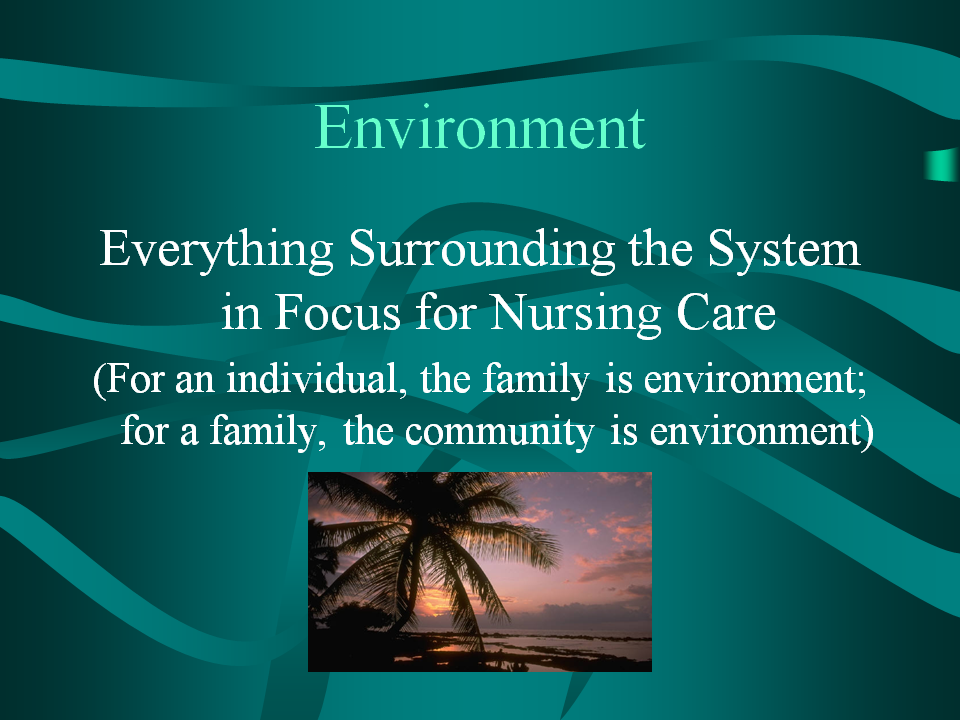 - The concept of environment comprises all things outside the system in focus of nursing care.